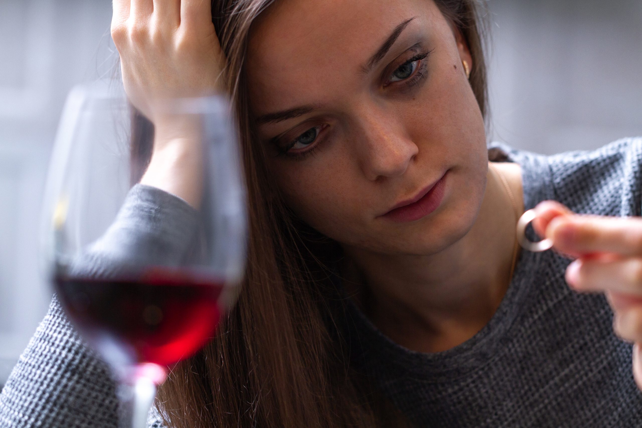 - Crying, divorced woman holding and looking on a wedding ring and drinking a glass of red wine because of adultery, betrayal and failed marriage. Divorce concept. Relationship and love end. Life problems