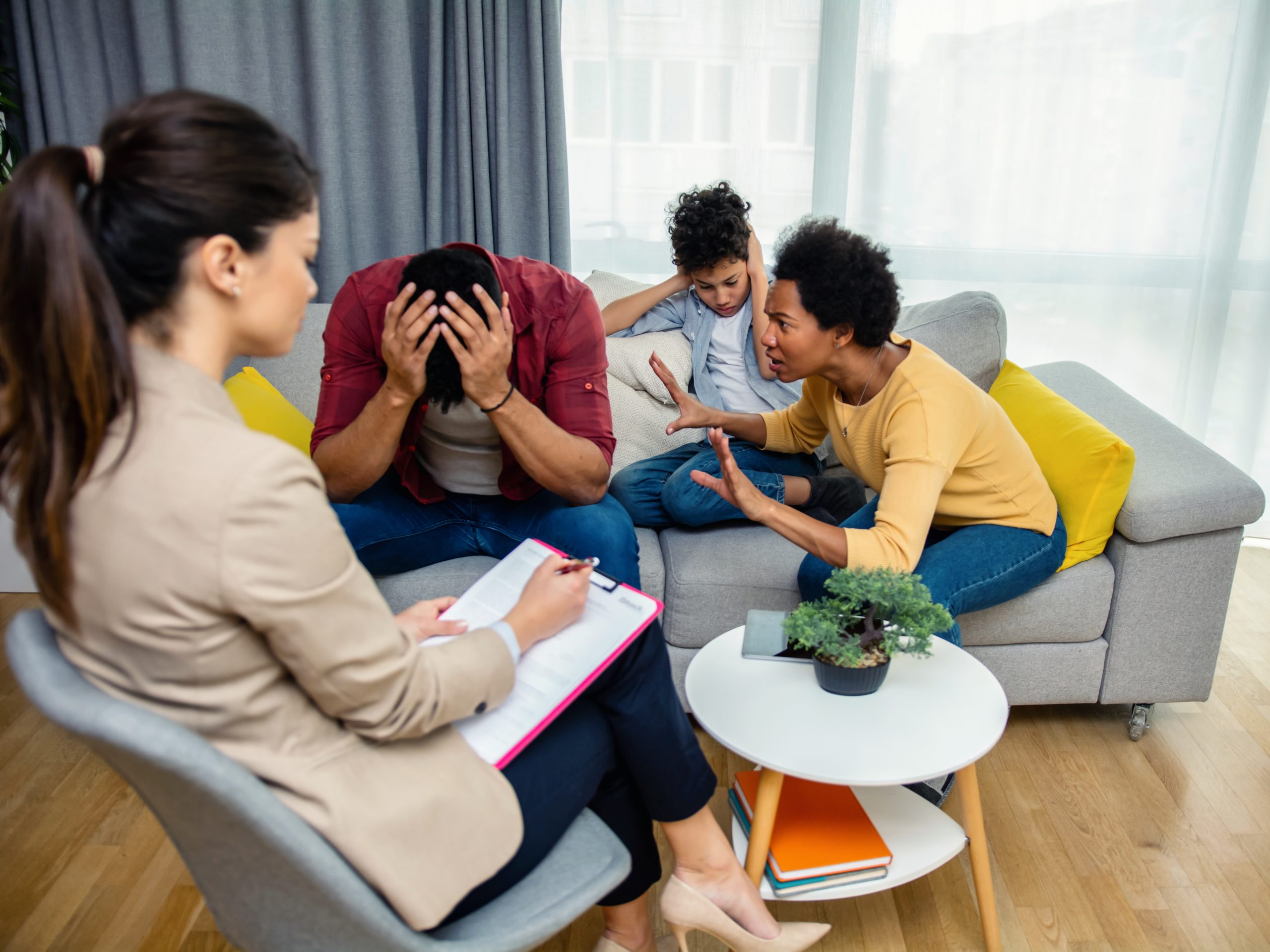 - Shot of a couple arguing during therapy session. Little boy suffering from parents conflict.