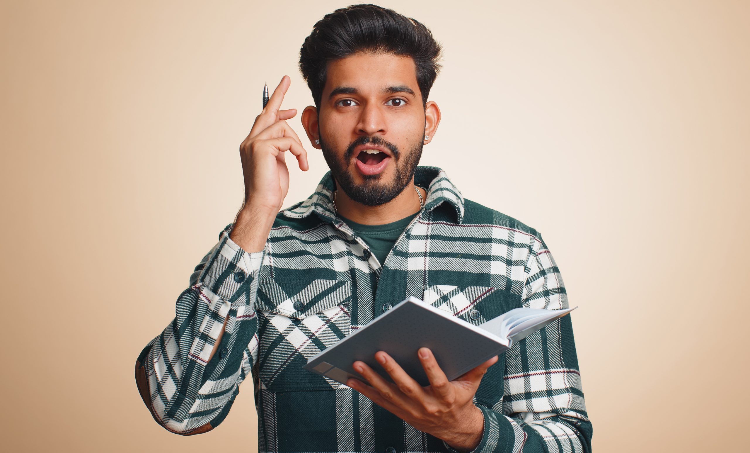 - Thoughtful journalist indian man making notes, writing down thoughts with pen into notepad notebook diary, to do list, good idea. Handsome bearded hindu guy isolated alone on beige studio background